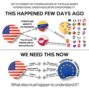 In ihrem Statement vom 6. Januar verurteilt unser Dachverband, die Union Europäischer Föderalisten (UEF), die Aggression der USA gegen Venezuela als schwerwiegenden Verstoß gegen das Völkerrecht und die regelbasierte multilaterale Ordnung. Die UEF fordert von der EU und ihren Mitgliedstaaten die Bildung neuer Allianzen zur Organisation des Widerstands gegen die Machtpolitik der USA und drängt auf die Einleitung einer föderalen politischen Vereinigung, die parallel zum Aufbau einer von den USA unabhängigen europäischen… » weiterlesen