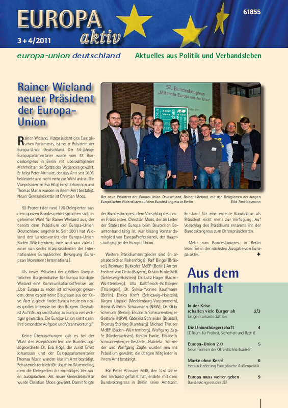 Die neue Ausgabe unserer Mitgliederzeitschrift Europa aktiv erscheint in diesen Tagen. Eine digitale Version gibt es schon jetzt auf unserer Webseite. In Ausgabe 3/4-2011 finden Sie das Ergebnis der jüngsten Präsidiumswahlen, einen Beitrag von EurActiv.de Chefredakteur Ewald König zum Stimmungsbild der Deutschen gegenüber der EU, einen Artikel zur Unionsbürgerschaft von EUD-Präsidiumsmitglied Ulla Kalbfleisch-Kottsieper sowie zahlreiche weitere Beiträge und Berichte aus den Landesverbänden.