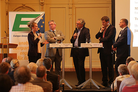 „Brauchen wir eine soziale Union?“, fragte Moderator Stefan Engstfeld MdL, Vorsitzender der Europa-Union Düsseldorf, im Themenraum „Integration oder Desintegration: Europa als Wirtschafts- und Sozialraum“. Die Podiumsgäste antworteten mit einem klaren Ja. „Die aktuelle Politik in der EU ist zu wirtschaftslastig ausgelegt“, kritisierte Stefan Gran vom Deutschen Gewerkschaftsbund. Dies sei nicht im europäischen Projekt angelegt, sondern Folge politischen Handelns. Seit dem Sozialkapitel im Vertrag von Amsterdam sei lange nichts im sozialen Bereich geschehen. Kristel Degener vom Verband Unternehmer NRW merkte an, dass auf europäischer Ebene zwar soziale Mindeststandards festgelegt worden seien, diese von vielen Mitgliedstaaten aber nicht umgesetzt würden. „Man kann Europa, wenn es funktionieren soll, nicht ausschließlich auf den Binnenmarkt reduzieren“, sagte auch Thorsten Klute. „Ein soziales Europa ist das Herz Europas“ so der Staatssekretär. Das Publikum brachte viele Themen in die Debatte ein. So wurde über die Flüchtlingskatastrophe im Mittelmeer, die Idee eines freiwilligen europäischen Jahres für alle sowie die Wohlstandsverteilung in den europäischen Gesellschaften diskutiert.