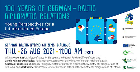 Seid am Donnerstag, den 26. August 2021 von 11:00 bis 12:30 Uhr im englischsprachigen Jugenddialog „100 Years of German-Baltic Diplomatic Relations – Young Perspectives for a future-oriented Europe” dabei. Verfolgt im Livestream wie junge Menschen aus Deutschland und dem Baltikum im Weltsaal des Auswärtigen Amtes vor Ort und digital in den offenen Dialog treten mit: