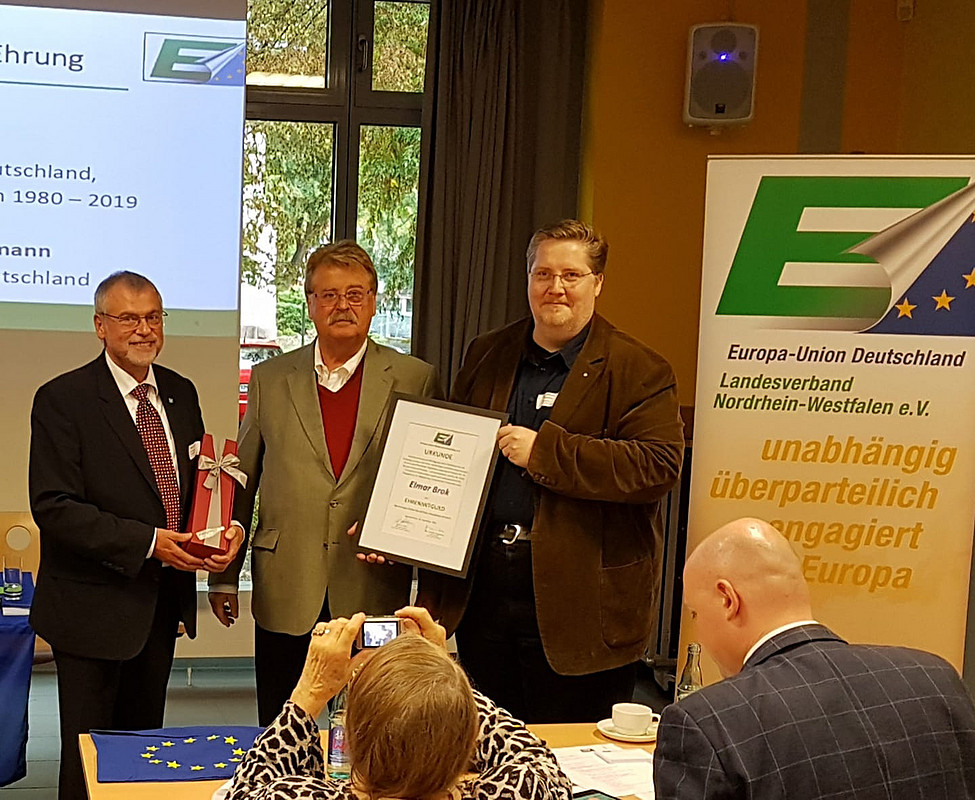 Ein weiterer, ganz besonderer Gast der diesjährigen Landesversammlung war Elmar Brok, der nach einer Laudatio von Heinz-Wilhelm Schaumann (Vize-Präsident der Europa-Union Deutschland) zum Ehrenmitglied der Europa-Union NRW ernannt wurde. Nach der Ehrung richtete Elmar Brok ernste Worte über die aktuelle politische Lage der EU an die Versammlung. „Das es wieder so weit kommt, dass man sich um Demokratie und Rechtsstaatlichkeit in Europa Sorgen machen muss, das hätte ich nie für möglich gehalten.“, so Brok, der von 1980 – 2019 als Abgeordneter im Europäischen Parlament aktiv war. Er stellte die Demokratie und Rechtsstaatlichkeit in Europa in den Vordergrund seiner Rede, sprach über die Bedeutung der EU in der Welt und betonte die Rolle der Europa-Union Deutschland, beständig Druck für die Weiterentwicklung der EU ausüben zu müssen.