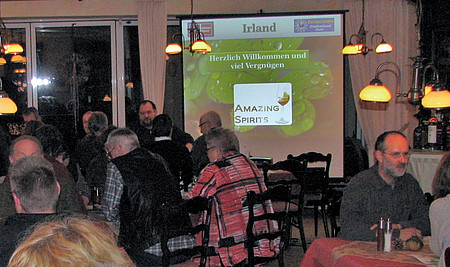 Neben köstlichem „Irish Stew“ als Grundlage und einem erfrischenden Guinness gab es auch eine kleine Reise durch die Welt des irischen Whiskey – mit entsprechend fachkundiger „Reiseleitung“ durch Markus Mattonet: „Ich werde Ihnen jetzt nicht erzählen, dass Sie Aromen von frischem Heu wahrnehmen können, auf dem eine Pferdedecke im Sonnenuntergang liegt“ spielte er auf die teilweise überspitzten Geschmacks-Beschreibungen der Fachwelt an „aber Sie können gerne beschreiben, was Sie riechen und schmecken!“