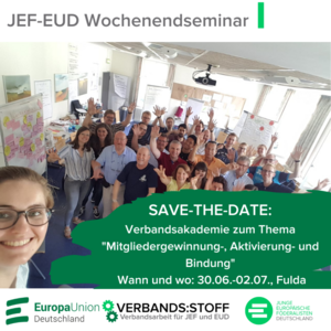 Die Akademie richtet sich an aktive Vorstände und Multiplikator:innen innerhalb JEF und EUD, die Freude daran haben, das erworbene Wissen für ihre Arbeit auf Landes-, Bezirks- oder Kreisverbandsebene zu nutzen und weiterzutragen. Euch erwarten Übernachtung und Verpflegung in der Jugendherberge Fulda, ein kleiner Teilnehmerbeitrag (EUD 40 Euro, JEF 25 Euro) sowie ein anteiliger Fahrtkostenzuschuss (bis zu 100 Euro).