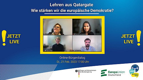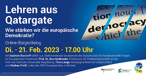 Bringen Sie Ihre Anliegen und Fragen ein bei unserem ersten Online-Bürgerdialog des Jahres 2023! Diskutieren Sie am 21. Februar von 17:00 bis 18:30 Uhr zum Thema „Lehren aus Qatargate – Wie stärken wir die europäische Demokratie?“ u.a. mit Gabriele Bischoff MdEP, Prof. Dr. Eva Heidbreder, Otto-von-Guericke-Universität Magdeburg, Timo Lange, LobbyControl, und Markus Preiß, ARD-Europastudio Brüssel.