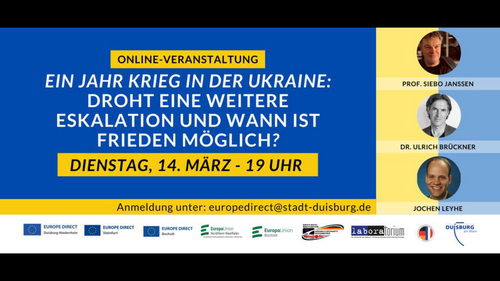 Ein Jahr nach dem Beginn der russischen Invasion in der Ukraine laden wir herzlich ein, mit Prof. Siebo Janssen, Dr. Ulrich Brückner und Jochen Leyhe über die mögliche weitere Entwicklung zu diskutieren.