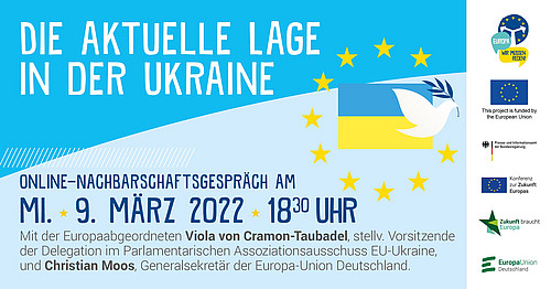 Treten Sie am Mittwoch, den 9. März, von 18:30 Uhr bis 19:30 Uhr in den virtuellen Austausch mit Viola von Cramon-Taubadel, stellv. Vorsitzende der Delegation im Parlamentarischen Assoziationsausschuss EU-Ukraine im Europäischen Parlament, und Christian Moos, Generalsekretär der Europa-Union Deutschland und Präsident des Begleitausschusses für die transatlantischen Beziehungen des EWSA, zur aktuellen Lage in der Ukraine.