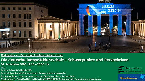 Am Mittwoch, dem 02. September lädt die Europa-Union NRW von 18:30 bis 20 Uhr herzlich zu einer Online-Diskussion zum Thema „Die deutsche Ratspräsidentschaft – Schwerpunkte und Perspektiven“ ein. Zu Gast sind Dr. Linn Selle, Präsidentin der Europäischen Bewegung Deutschland, Dr. Mark Speich, Staatssekretär für Bundes- und Europaangelegenheiten im Land NRW, und Dr. Jörg Wojahn, Leiter der Vertretung der Europäischen Kommission in Deutschland zu. Die Moderation übernimmt Dr. Sigrid Fretlöh, Mitglied im TEAM EUROPE Rednerpool der…